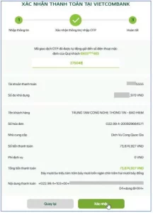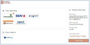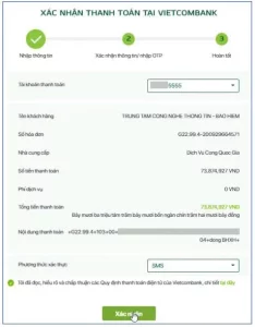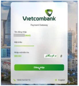 Doanh nghiệp nhấn Thanh toán. Hệ thống sẽ chuyển sang giao diện Payment Gateway của ngân hàng được lựa chọn, ví dụ Vietcombank.